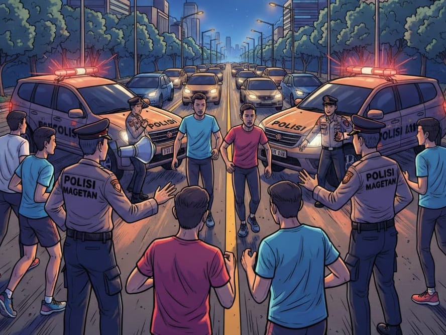 Magetan, ReportaseTimes – Aksi balap orang yang sempat viral di media sosial di Jalan Raya protokol Maospati–Magetan, tepatnya di Desa Sugihwaras, Kecamatan Maospati, dibubarkan aparat kepolisian, Sabtu malam (21/2).