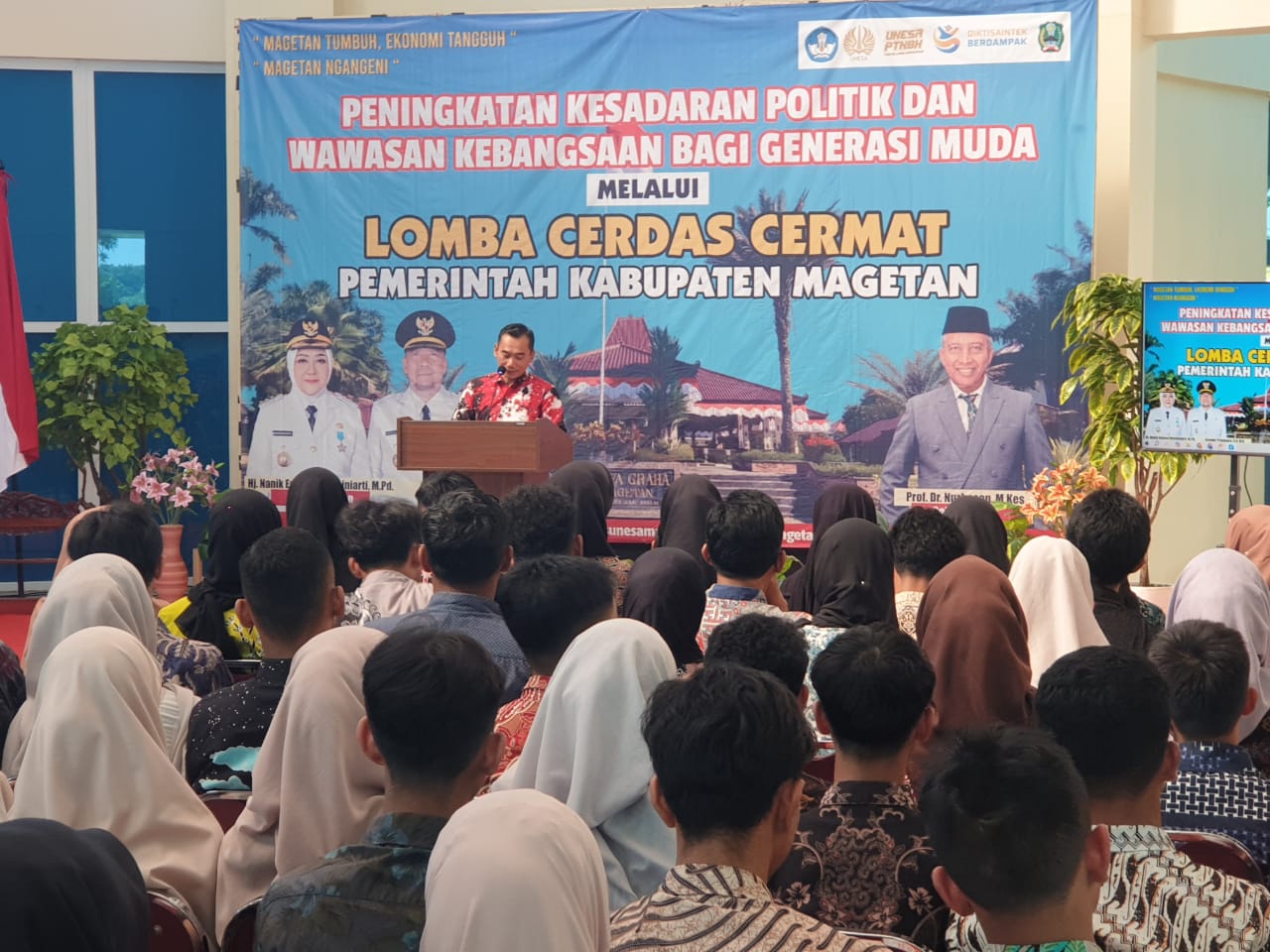 Magetan, ReportaseTimes – Badan Kesatuan Bangsa dan Politik (Bakesbangpol) Magetan menggelar kegiatan Peningkatan Kesadaran Politik dan Wawasan Kebangsaan bagi Generasi Muda melalui Lomba Cerdas Cermat, yang bertempat di kampus 5 Unesa Magetan, Minggu (30/11/2025)