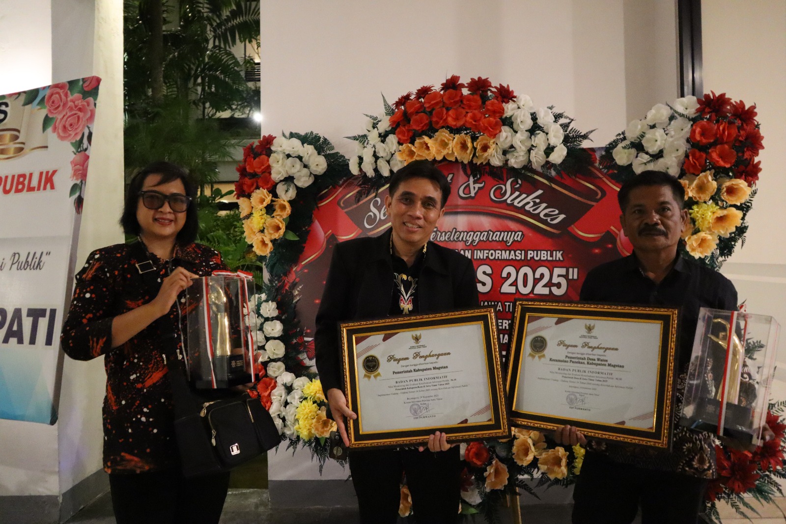 Tiga penghargaan itu masing-masing diraih Pemerintah Kabupaten Magetan yang menyabet predikat Badan Publik Informatif dengan nilai 96,10 untuk kategori pemerintah kabupaten/kota. Disusul Desa Wates, Kecamatan Panekan yang juga meraih predikat Badan Publik Informatif dengan nilai 92,10 di kategori pemerintah desa. Serta Desa Gonggang, Kecamatan Poncol yang dinobatkan sebagai Badan Publik Menuju Informatif dengan nilai 86,76.