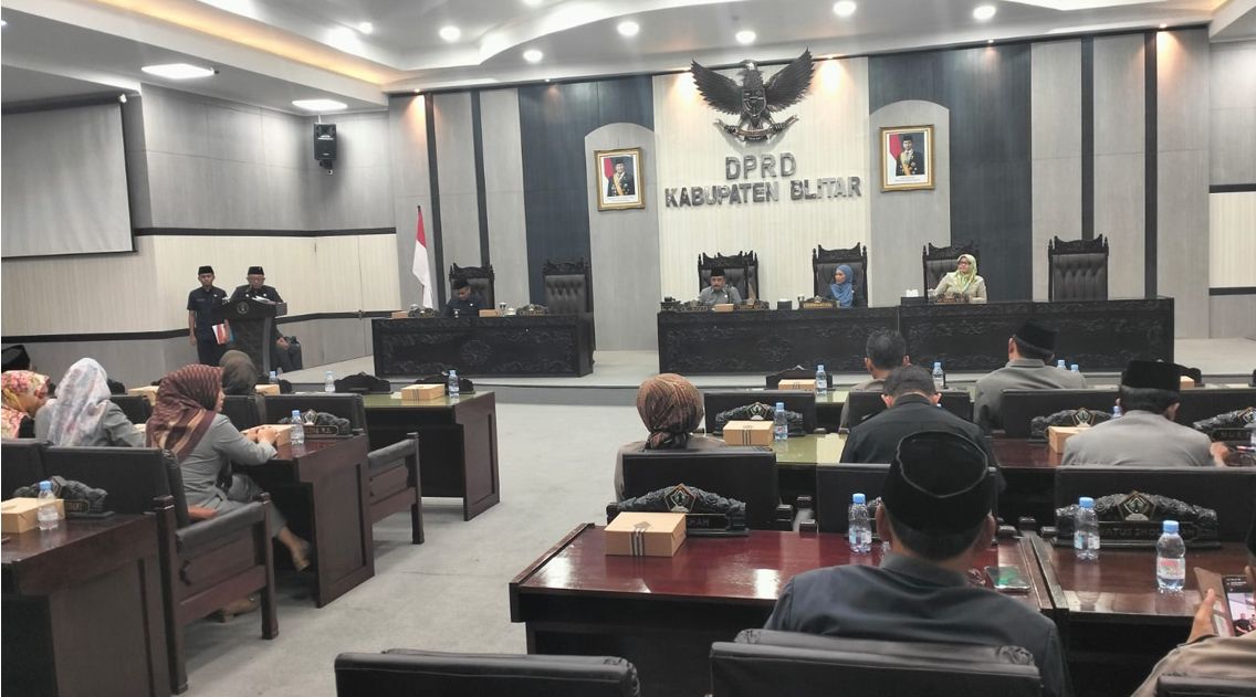 Rapat paripurna tersebut dipimpin langsung oleh Wakil Ketua I DPRD Kabupaten Blitar, H. M. Rifa’i, didampingi Wakil Ketua II, Hj. Ratna Dewi Nirwana Sari, S.S., S.H., M.Kn., dan Wakil Ketua III, Hj. Susi Narulita Kumala Dewi, S.IP., M.AP. Turut hadir Sekretaris DPRD, Haris Susianto, S.H., M.Si., yang mendampingi jalannya sidang.